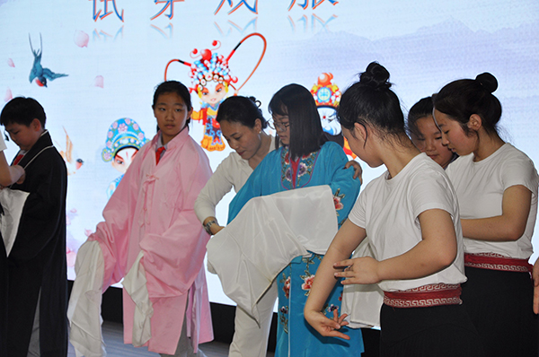 在沉浸式体验环节中,同学们积极参与有趣的有奖竞答,现场气氛热烈而欢快。还有同学换上精美的戏曲服饰,手持各式道具,或扮成英勇的武将,或扮成婀娜的旦角,仿佛穿越时空,置身于一个五彩斑斓的戏曲世界。