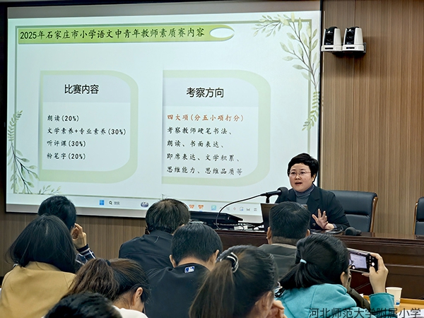 教学处主任刘晓云带来《语文教师如何提升自身素养》专题讲座。她以石家庄市语文素质赛为引,为教师专业成长锚定方向,提出:“读中扎根、课中磨功、思中精进,”呼吁老师们通过深度阅读筑牢根基、打磨课堂练就真功、持续反思不断精进。以自身素养的提升,助力学生语文生命的蓬勃成长,成为有温度、有厚度、有深度的教育引路人。