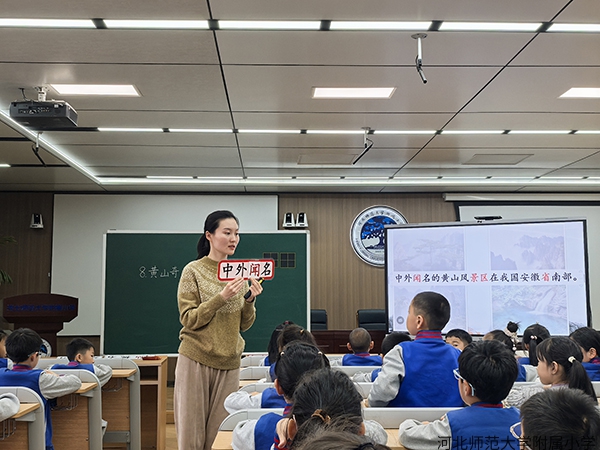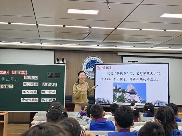 本次研究课由张可心老师执教《黄山奇石》一课。课堂上,张老师以“美丽中国行”为情境,将读文、识字、写字自然融入黄山风光的探索中:识字环节结合奇石图片、生活实例解析生字,让抽象汉字变得具象鲜活;阅读品读时,引导学生跟随文本欣赏奇石风貌,领悟“把石头写活”的表达妙法;表达训练环节则搭建想象支架,实现从“体会表达”到“学会表达”的落地。整堂课以情境贯穿始终,将识字写字、阅读理解与语言训练有机融合,既贴合低年级学生的认知特点,又让课堂充满童趣与活力。
