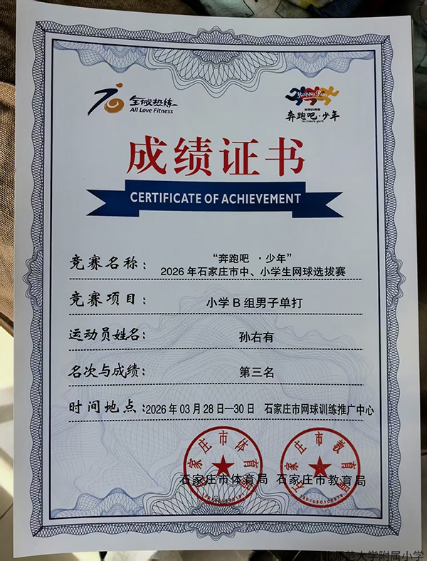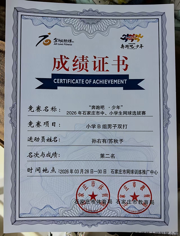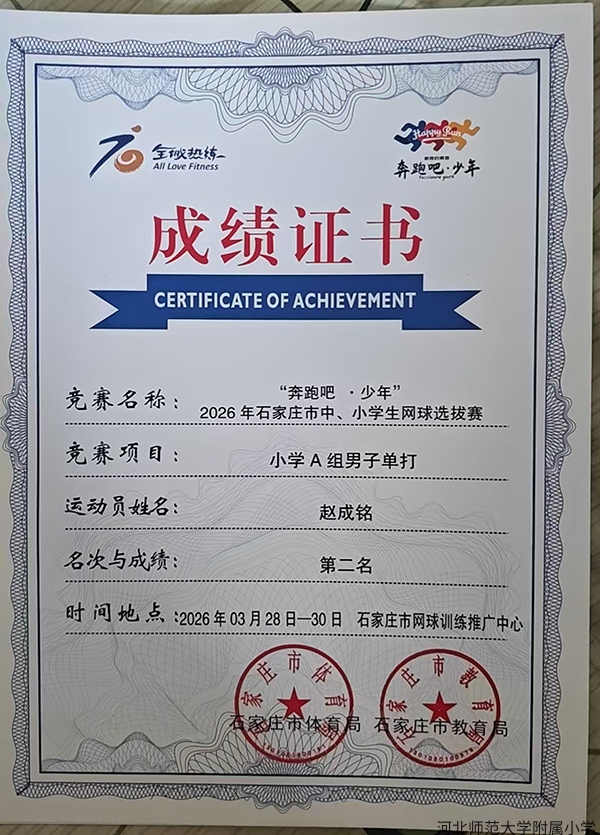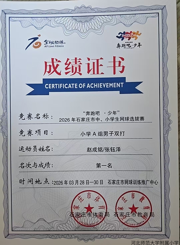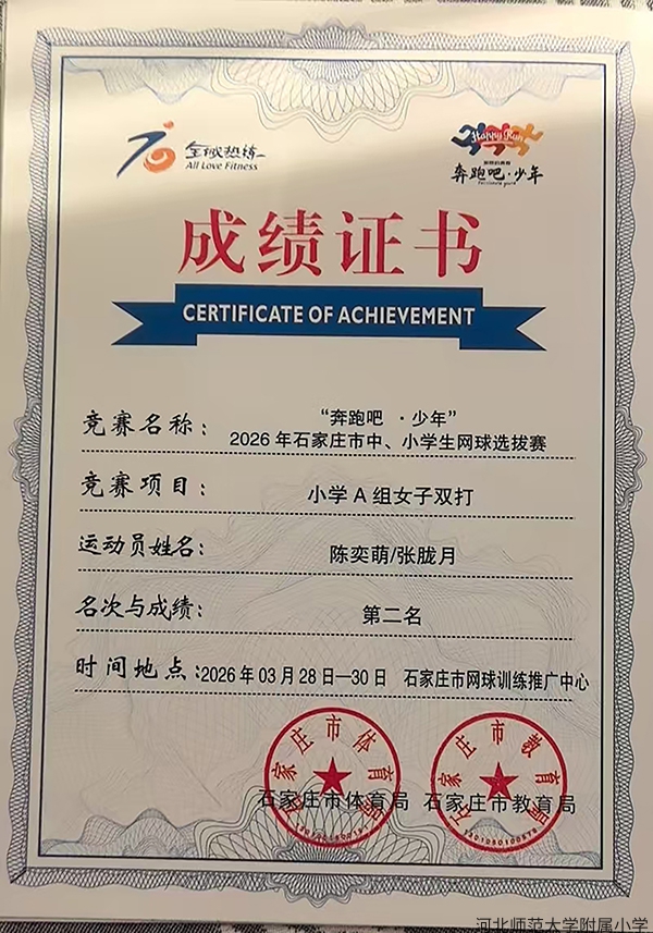 近日,由市体育局、市教育局联合主办的 2026 年石家庄市中小学生网球选拔赛,在市网球训练中心顺利落幕。我校学生奋勇拼搏,喜获佳绩。