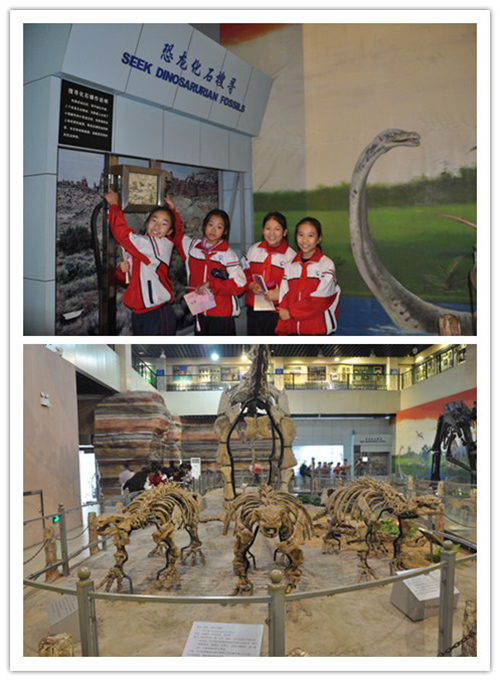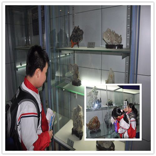 博物馆共有五层,分别是:宇宙与地球厅、岩石与矿物厅、宝石与矿产厅、恐龙厅和古生物厅。当走进恐龙厅时,孩子们一下子就被巨大的恐龙雕像给吸引了,同学们看到了各种各样的恐龙骨骼化石、恐龙蛋、观看了恐龙从产生到灭绝的短片。在接下来的矿物厅、地球厅和古生物厅里,一颗颗水晶石头、一幅幅震撼的画面、一件件古生物化石展品把学生们的视线紧紧吸引,加上讲解员的细心讲解,学生们时而点头,时而发出震撼的声音,不时还做下记录,在参观中也不忘学习。