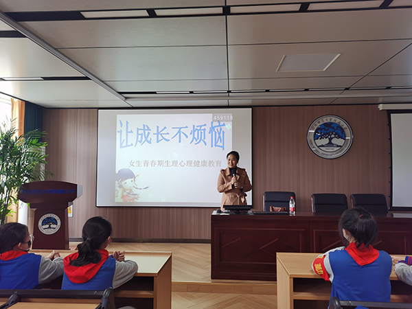 孙老师则与女孩子们探讨了青春期的困惑和烦恼。首先,她通过播放动画的形式,把青春期的身体变化形象生动地展示给同学们。接下来,她用朋友式的谈话迅速拉近了与孩子们之间的距离。幽默风趣的语言、亲切和蔼的态度,让孩子们在轻松愉悦的氛围中了解身体变化的原因和应对措施。最后,孙老师就青春期心理变化和会遇到的问题进行互动分享,使同学们了解“五种安全警报”,提升了自我保护意识。