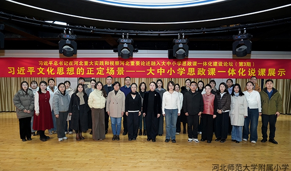为深入贯彻落实立德树人根本任务,推动大中小学思政课一体化建设走深走实,2025年12月19日下午,“习近平总书记在河北重大实践和视察河北重要论述”融入大中小学思政课一体化(第3期)建设论坛说课展示活动在我校举行。本次活动由河北师范大学马克思主义学院、河北省大中小学思政课一体化集体备课中心(河北师范大学、河北科技大学、石家庄学院—石家庄市)等多家单位联合主办。
