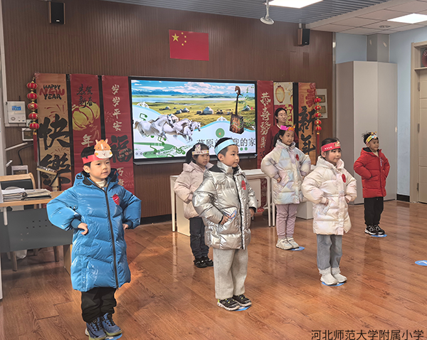 “牧场”里,“小马驹们”抽签背诵课文,而后观察图形、寻找规律并动手摆放;“粮仓” 中,大家随机挑选麦穗和玉米,完成词语认读与口算挑战,还在画架前画出心仪水果;“马场” 上,孩子们收下新年红包,借助拼音读出祝福语,随后跳过障碍栏,伴着音乐唱跳《草原就是我的家》;“驿站”内,大家递送新年信件、补全内容并大声朗读,用英语说出小动物名字并分类,最后齐唱《Happy New Year》。