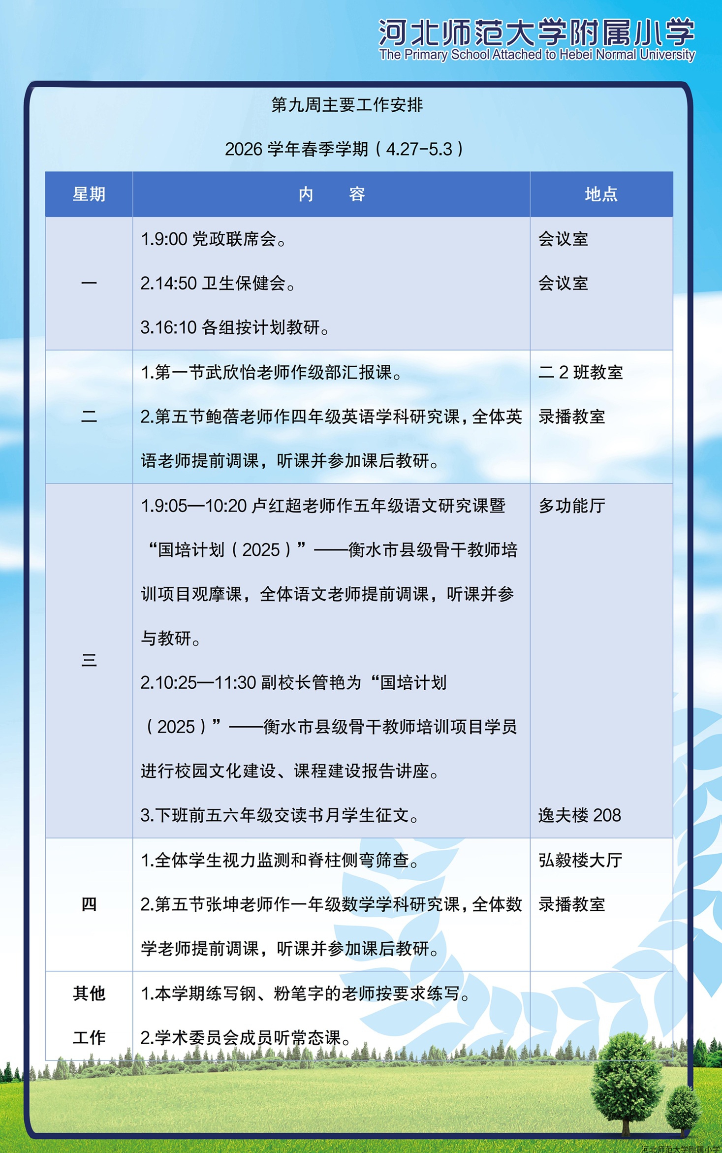 第九周主要工作安排