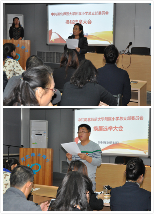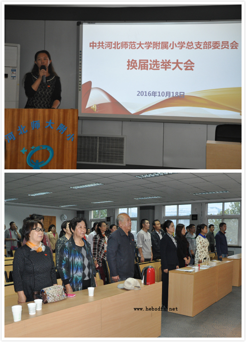 10月18日下午,中共河北师范大学附属小学总支部委员会召开换届选举大会,会议由田丽娜同志主持,大会在庄严的国歌声中开幕。