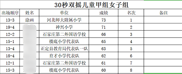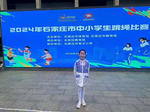 2024年4月27日由石家庄市体育局和石家庄市教育局主办,长安区教育局承办的石家庄市中小学生跳绳比赛圆满落幕,我校三6班涂画同学在比赛过程中沉着冷静,凭借不凡的功底和良好的体育素养,荣获30秒双摇儿童甲组女子组第一名。