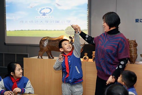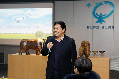校长们首先来到二楼多功能厅,杨富兴校长致欢迎词。随后,杨校长用朴实、幽默的语言向各位校长讲述了学校近几年在校园环境及文化内涵方面的发展、变化:“追求人的成全 创造适切教育”的教育理念已扎根附小人的心中,每一位老师,每一位学生一定会在学校找到适合自己发展的平台;“五香校园”(书香、墨香、花香、果香、饭香)的特色建设,大幅提升了师生们的幸福感;附小班子独特的管理智慧更是得到了校长们的赞同。接着,白硕哲老师和孩子们展示了一节三年级作文与陶艺的整合课,跟随白老师生动和充满激情的讲述,孩子们进入了陶艺的艺术世界,孩子们触摸、观察、欣赏,给想象插上翅膀,他们编的有趣故事赢得了校长们热烈的掌声。