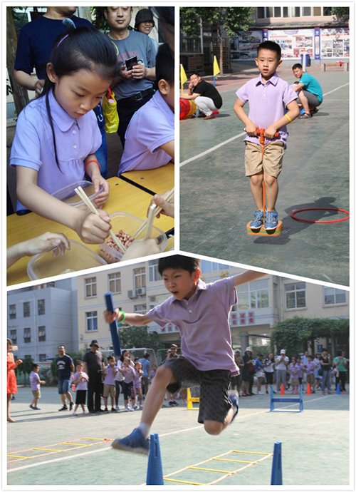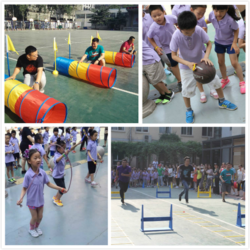 精心设计的每一个项目不仅孩子喜欢,家长也大加赞赏。彩虹隧道项目需要孩子们先利用弹跳鞋双脚跳跃,然后跑向彩虹隧道钻进隧道,出来后跑向弹跳鞋再跳跃回起跑线。大家虽然没有接触过,但是一招一式都很认真,教练的考核更是严格,有违规现象整个小队要被“加时”,表现优秀的小队奖励“减时”,在游戏中孩子们的规则意识得到了加强。跳绳比赛是体育课项目,但是团队计分,孩子们彼此传授技巧,有的主动把好用的跳绳交给伙伴。跨栏接力竞争激烈,每个孩子都尽全力跑好自己的一棒……比赛有专业性、有趣味性,运动场上充分体现了孩子们的团队意识和拼搏精神。一位教体育运动的家长说:“参加了很多运动会,这是最激动人心的一次。”